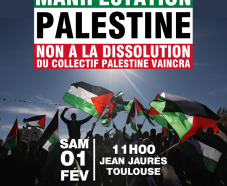 60 organisations politiques, syndicales et associatives de Toulouse appellent à manifester pour dénoncer la dissolution du Collectif Palestine Vaincra et faire front face à la criminalisation de la solidarité avec le peuple palestinien. Soyons nombreuses et nombreux ce samedi 1er février dès 11H au départ du métro Jean Jaurès à Toulouse pour dire haut et fort que soutenir la Palestine n’est pas un crime !