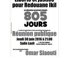 Le 30 juin 2016, cela fera 805 jours que Rédouane Ikil, père de famille et ancien directeur de la poste de Bellefontaine est en détention provisoire. Il clame son innocence dans une affaire qui a tout d’une parodie judiciaire à caractère raciste : il est accusé de complicité dans le braquage de deux bureaux de poste à Toulouse, dont celui qu’il avait dirigé. Or 4 années après les faits, le dossier d’instruction est toujours vide ! L’acharnement d’un juge d’instruction le maintient (…)