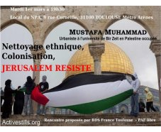 Mustafa nous parlera de Jérusalem/Al Quds, du nettoyage ethnique larvé dans Jérusalem Est, de l’Intifada actuelle, alors que Jérusalem/Al Quds résiste, 48 ans après son annexion par Israël.