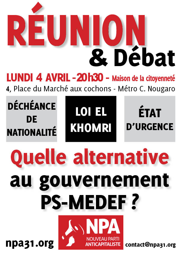 Pour discuter de cela, le comité NPA Toulouse Nord vous invite à une réunion-débat lundi 4 avril à 20h30 à la maison de la citoyenneté (4 place du Marché au cochon - Métro C. Nougaro).