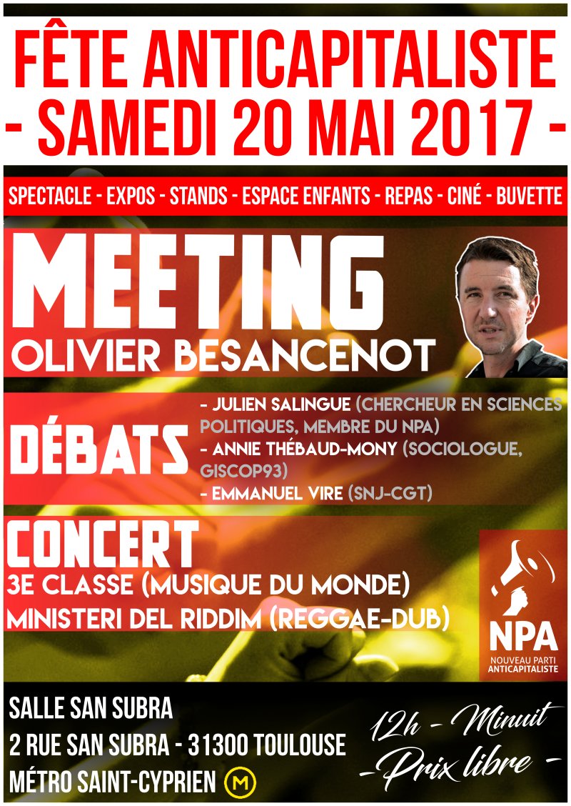 24 avril 2017La fête anticapitaliste, organisée par le NPA 31, aura lieu samedi 20 Mai à Toulouse.