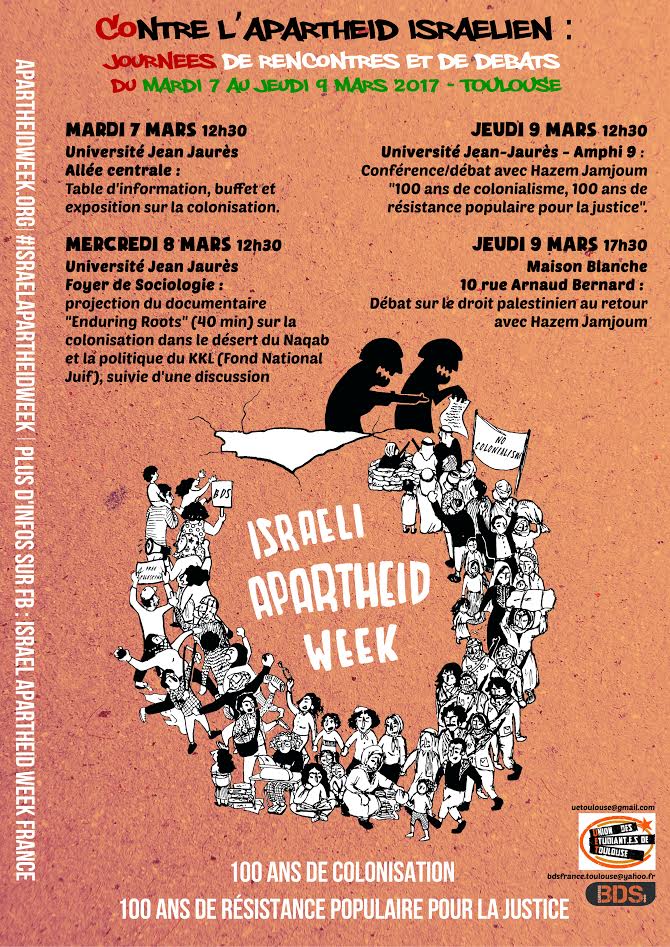 7 mars 2017Daniel Lacroix, le Président de l’Université du Mirail (UT2J) a décidé d’interdire la tenue sur l’Université d’une conférence sur l’apartheid israélien dans le cadre de l’Israeli Apartheid Week (IAW). Cette échéance est pourtant organisée dans plusieurs dizaines d’universités à travers le monde. Le motif ? Le sujet serait trop polémique et la situation d’état d’urgence et le plan Vigipirate empêcheraient l’Université de risquer des débordements.