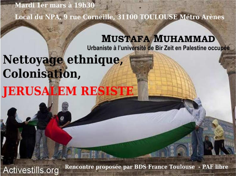 Mustafa nous parlera de Jérusalem/Al Quds, du nettoyage ethnique larvé dans Jérusalem Est, de l’Intifada actuelle, alors que Jérusalem/Al Quds résiste, 48 ans après son annexion par Israël.