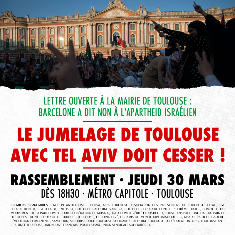 29 mars 2023Dans une lettre ouverte adressée à la mairie de Toulouse, trente organisations toulousaines demandent à ce que la ville rose suive la voie de la mairie de Barcelone et mette fin à son jumelage avec Tel Aviv, la capitale de l’apartheid israélien. Ces différentes organisations politiques, syndicats d’étudiants et de travailleurs, organisations féministes et antiracistes appellent à se rassembler le jeudi 30 mars prochain dès 18H30 au métro Capitole en soutien au peuple palestinien et pour faire entendre cette exigence !
