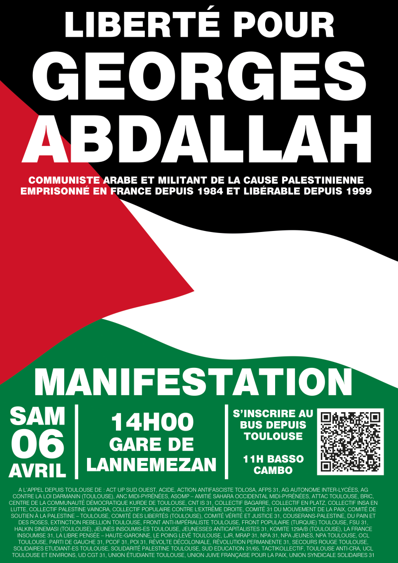 19 mars 2024A travers un appel commun, plus de 55 organisations de Toulouse appellent à manifester pour la libération de Georges Abdallah le samedi 6 avril devant la prison de Lannemezan où il est détenu. Cette initiative s’inscrit dans le cadre d’un mois de mobilisation internationale.