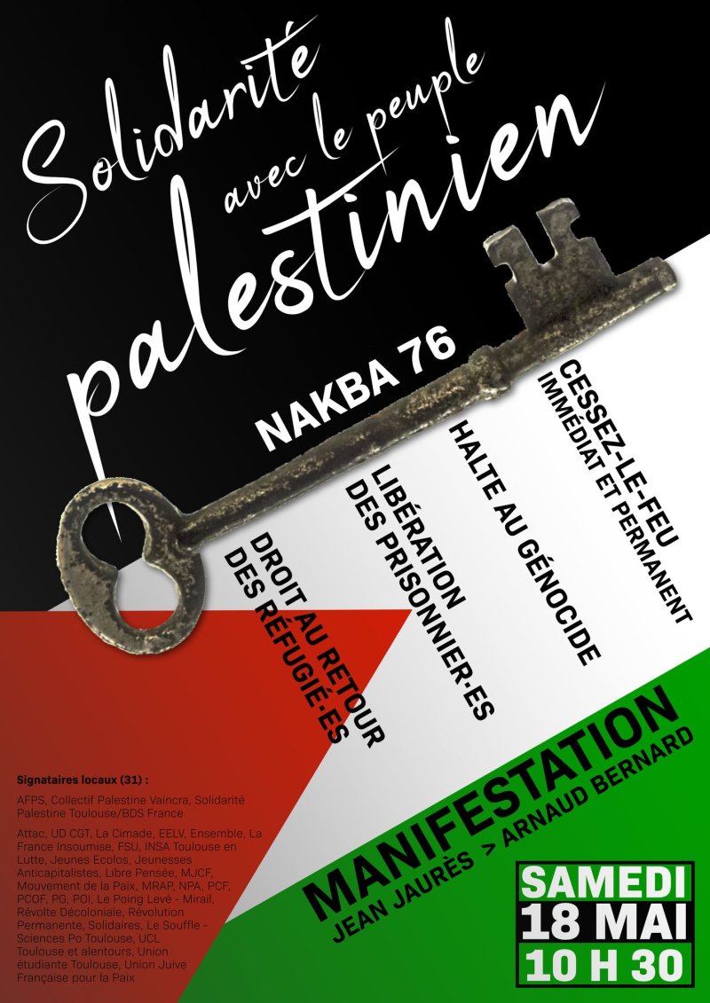 Attac, CCFD-Terre Solidaire, UD CGT, La Cimade, EELV, Ensemble, La France Insoumise, FSU, INSA Toulouse en Lutte, Jeunes Ecolos, Jeunesses Anticapitalistes, Libre Pensée, MJCF, Mouvement de la Paix, MRAP, NPA, PCF, PCOF, PG, POI, Le Poing Levé - Mirail, Révolte Décoloniale, Révolution Permanente, Solidaires, Le Souffle - Sciences Po Toulouse, UCL Toulouse et alentours, Union étudiante Toulouse, Union Juive Française pour la Paix